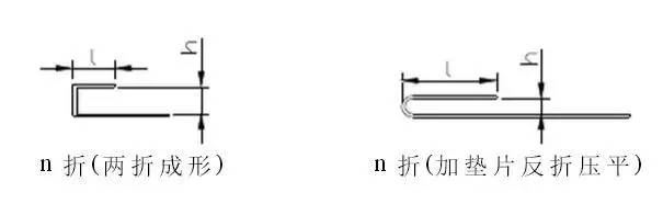 2 N折:N折成形時依據(jù)l及h尺寸值而采取不同的加工方式,一種是直接分為兩折成形,另一種是加墊片反折壓平,一般情況下,N折中的H為較重要尺寸.