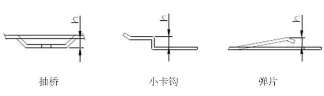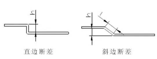 3 Z折:Z折又稱為斷差,根據(jù)成形角度分為直邊斷差和斜邊斷差,加工方式則依照斷差高度而定, 直邊斷差當斷差高度h小于3.5倍料厚時采用斷差模或易模成形,大于3.5倍料厚時采用正常一正一反兩折完成. 斜邊斷差當斜邊長度l小于3.5倍料厚時采用斷差?;蛞啄3尚?大于3.5倍料厚時采用正常一正一反兩折完成